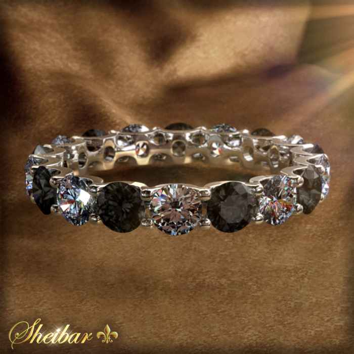 טבעת יהלומים "אינטרנטי שחור", טבעת גלגל בעלת נוכחות מרשימה ויוקרתית להפליא. טבעת המשובצת לכל אורכה ביהלומים גדולים ומרשימים, אשר לא ניתן לפספס אף אחד מהם ללא ספק..! כל יהלום בפני עצמו נותן את הנצנוץ והברק לכל אורך הטבעת. הטבעת משובצת ביהלומים שחורים ולבנים אחד אחרי השני, מה שמקנה לטבעת מראה יחיד במינו. ניתן לראות שכל יהלום ויהלום מוחזק באמצעות 4 שיניים בעבודת גימור יפיפייה להפליא. טבעת זו יכולה לשמש כטבעת נלוות, אך ללא ספק גם כשלעצמה בלבד, לא ניתן להסיר ממנה את המבט.(ניתן לשבץ את כל סוגי היהלומים ואבני חן לפי בחירה).