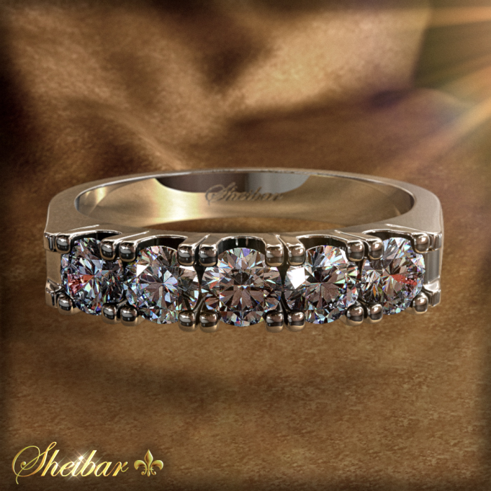 טבעות מעגלי יהלומים, טבעת 5 יהלומים. טבעת מרשימה ובעבודה ייחודית . הדבר הבולט בטבעת זו הוא גודלם המרשים של היהלומים. כ-5 יהלומים גדולים, שכל אחד מהם 0.20 קראט, סה"כ 1.00 קראט בטבעת כולה. השיבוץ נעשה בשיבוץ שיניים המרשים ויפה, בכדי למקסם את נוכחות ונצנוץ התכשיט. הזהב ממנו עשויה הטבעת הוא זהב יוקרתי של 18K, אשר נעשתה בעבודת לייזר מדוייקת וסימטרית בכדי לשמור על עבודת גימור וליטוש מהגבוהות ביותר. מהפרופיל אפשר לראות שכל יהלום עומד על דמוי "כתר" המחזיק אותו, כתר של זהב מבריק ונוצץ. עבודת שיבוץ, ליטוש ואיכות התכשיט מהמרשימות שיש... מתנה מושלמת ובטוחה...!!