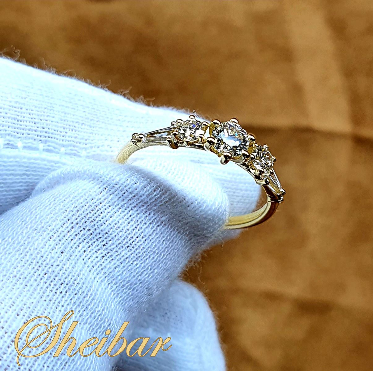 טבעת זהב ויהלומים בעיצוב אישי. טבעת שנעשתה בעבודת יד שהוזמנה בעיצוב אישי. הדבר הראשון אליו ניתן לשים לב הוא למידות והגדלים השונים של היהלומים. כל יהלום נבחר בקפידה בכדי שהוא יתאים בצורה המדויקת ביותר למקום שלו. יש על הטבעת 4 מידות שונות של יהלומים, שבינהם ניתן לראות יהלומים בליטוש מיוחד ששלו "טפר". "טפר" הוא ליטוש מוערך שהולך ונהיה צר לאורך היהלום, זה מה שעושה אותו למיוחד במינו ולליטוש מיוחד. הטבעת נעשתה בזהב 18K. ניתן להזמין את הטבעת בזהב צהוב/לבן/אדום. טבעת שונה ומיוחדת במינה.