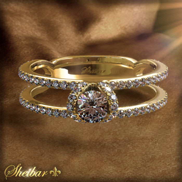 טבעות אירוסין, מודל "שאפו" אשר מגיע בהחלט שאפו לאדם שחשב על העיצוב הייחודי הזה. בבסיס הטבעת ישנו חלק מבריק של זהב המזכיר צורת אליפסה, בעוד שממנו יוצאים להם 2 פסי זהב עדינים וסימטריים כל כך בכדי לשמור על צורת הטבעת ישרה לאורך כל התכשיט. על 2 שורות זהב אלו ניתן לראות עבודת שיבוץ עדינה ומקצועית להפליא בכדי להמשיך ולשמור על סימטריות ויופיו של התכשיט. הדבר העיקרי שיש לשים לב אליו הוא ראש התכשיט המיוחד במינו ללא ספק...! משני פסי הזהב בצידי הטבעת ניתן לראות שיוצאים 2 מעגלים עדינים של זהב המדמים מראה של "עלי כותרת" כמו של פרח שנפתח רק עכשיו המשובצים גם הם ביהלומים יפים ולבנים. עלי כותרת אלו מחזיקים את ה"תכשיט" החשוב ביותר בטבעת שהוא היהלום המרכזי המדהים.