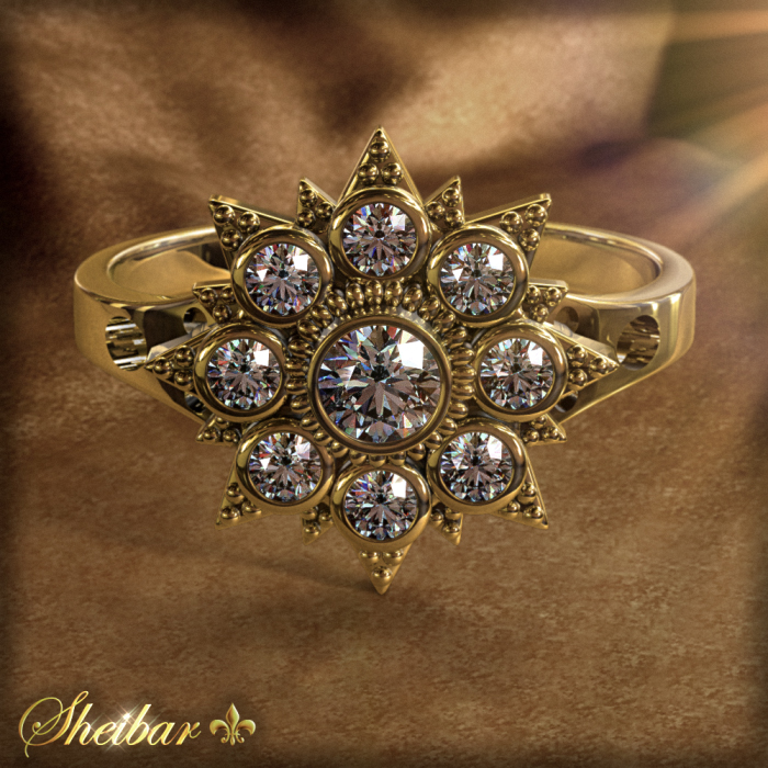 דגם טבעת יהלומים "שושנה וינטג’", טבעת בסגנון עתיק אך חדשני. בטבעת זו משובצים כ-9 יהלומים בראש הטבעת. 8 יהלומים בצורת מעגל, כאשר במרכז מעגל זה נמצא יהלום מרכזי גדול יותר המורם באמצעות הגבהה יפה ועדינה של זהב, וזאת בכדי להבליט את היהלום הגדול מהשאר. מסביב ובין כל היהלומים שבטבעת ניתן לראות עבודת זהב בעיצוב מרשים ומעניין. מסביב לראש ניתן לראות צורות של כוכבים עדינים ויפים היוצרים יחדיו צורה של שמש. ניתן לשלב בטבעת מגוון של אבנים בכל מיני צבעים בעיצוב אישי ולפי הזמנה. ללא ספק טבעת מעוצבת ומיוחדת...