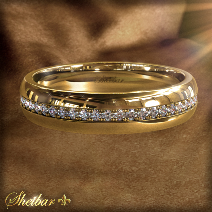 דגם טבעת יהלומים, גלגל זהב נישואין קלסית לגבר "SHEIBAR" עשויה זהב K18טבעת משובצת לאורכה יהלומים המתוחמים בתוך שורה אחידה ומדויקת בזהב. היהלומים שובצו בצורה צמודה, צפופה ומדויקת במטרה למקסם את נוכחותם ונצנוצם. טבעת זו יכולה גם להגיע כטבעת נישואים חלקה ולאחר מכן ניתן לשבץ עליה את היהלומים. אפשרות לחריטה בחלקה הפנימי של הטבעת.