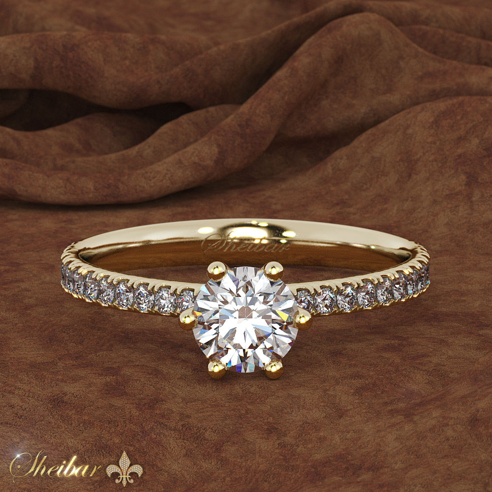 טבעת אירוסין ויהלומים - דגם: סוליטרי. טבעת אירוסין מדהימה, מלכותית, יוקרתית ובטוחה. עשויה זהב 18K זהב מלא, ובנויה בצורה שחלקה התחתון של השינה הוא רחב והולך ונהיה צר יותר לקראת הראש על מנת להדגיש עוד יותר את היהלום המרכזי. שיבוץ בצדדים שיבוץ בסגנון "דגרדה" ובו היהלומים מסודרים אחד אחרי השני על פי גודל: מהגדול - לקטן על מנת לתת דגש ליהלום המרכזי. כל יהלום בצד ממוין ומשובץ על ידי 4 שיניים. במרכזו ראש של 6 שיניים קלאסיות ורחבות במטרה להחזיק את היהלום המרכזי של 1 קראט, גבוה, בטוח ומודגש. טבעת אירוסין זו טבעת ברמה גבוהה מאוד ומושקעת ביותר!