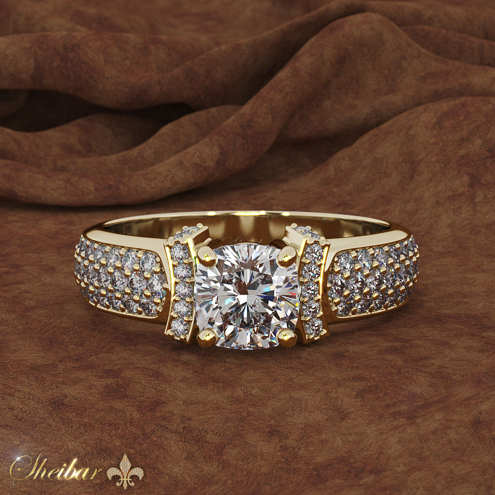 טבעות אירוסין ויהלומים טבעת חושן בומביי טבעת יהלומים מרשימה בעלת נוכחות ויוקרה. משובצת במרכזה יהלום קושן מהמילה צורת כרית- יהלום מלבני עם פינות מעוגלות הנחשק מאוד בשוק וקשה להשגה. בצידי היהלום המרכזי 2 פסי זהב מעוקלים המשובצים לאורכם יהלומים קטנים היוצרים מסגרת מושלמת ליהלום המרכזי. בצידי הטבעת משולב על גבי פסי הזהב חישוק בומביי מעוגל שמשובץ ב-3 שורות של יהלומים בשיבוץ זיגזג מה שנותן מראה "שטיח יהלומים". טבעת יוקרתית, איכותית, ומאוד מרשימה.