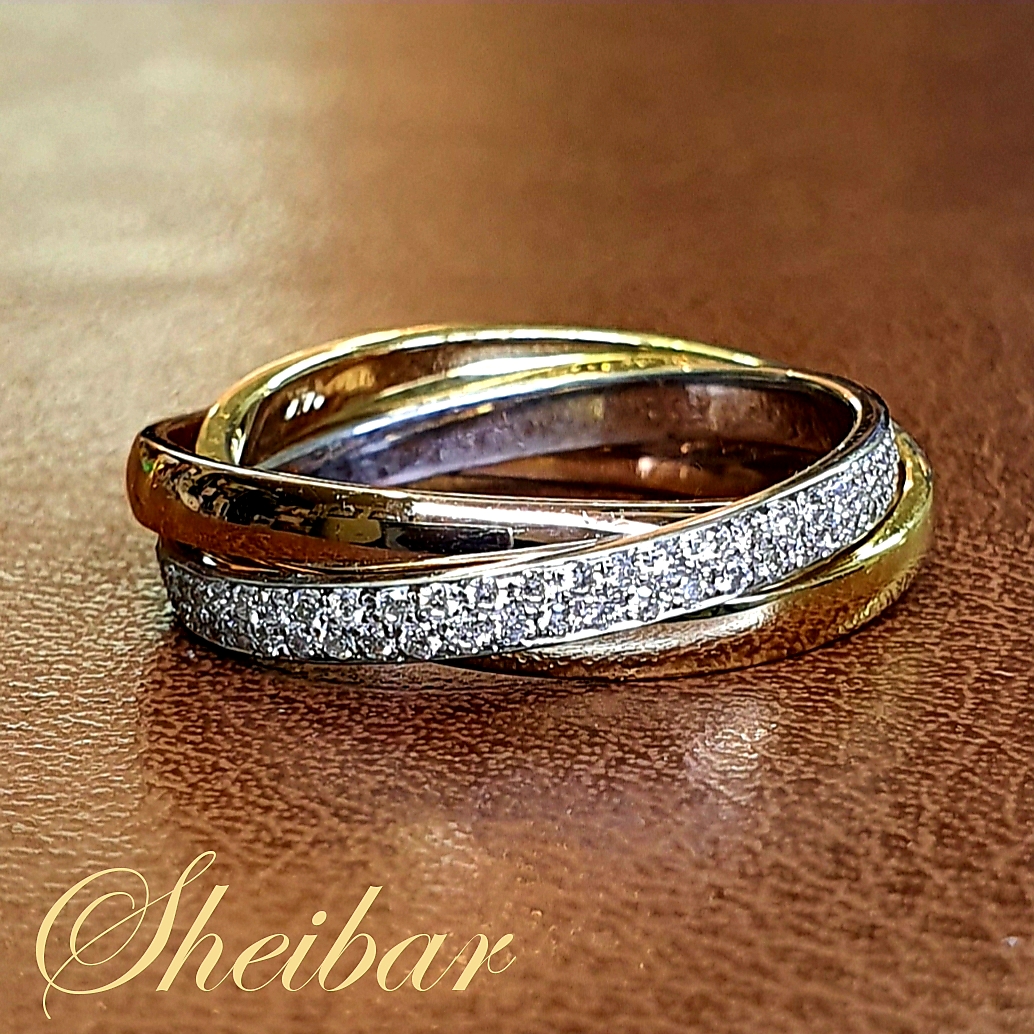 טבעת זהב ויהלומים "טריפל". טבעת שמשלבת 3 טבעות בצבעים שונים זהב צהוב/לבן/אדום(ניתן לבחור את צבע הטבעות). מה שמיוחד בטבעת הזו הוא השילוב של 3 הטבעות אחד בשני. על אחת הטבעות משובצים 2 שורות של יהלומים עדינים ויפים בשיבוץ שיניים. ניתן להוסיף חריטה על גבי אחת מהטבעות החלקות. טבעת מיוחדת במינה