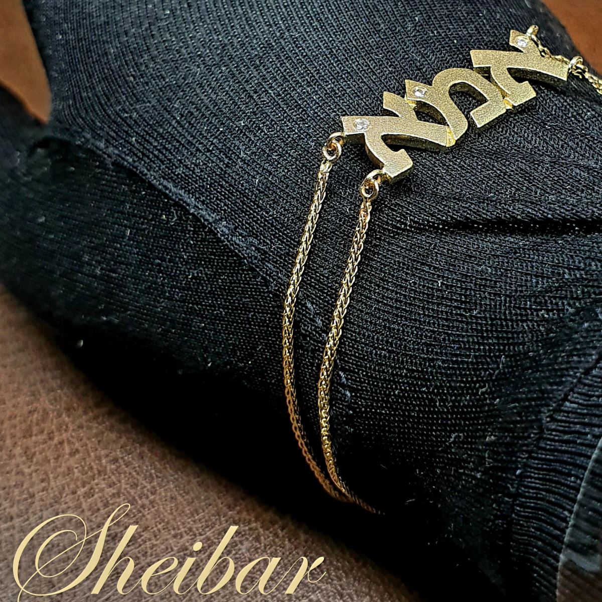 צמיד זהב "אמא" משובץ. צמיד שם איכותי מזהב מלא 14K. על כל אות משובץ יהלום נקי ולבן. כשר מכל צד יש 2 שרשראות זהב שמחוברות אליו במרכז. מתנה מושלמת לכל אמא!