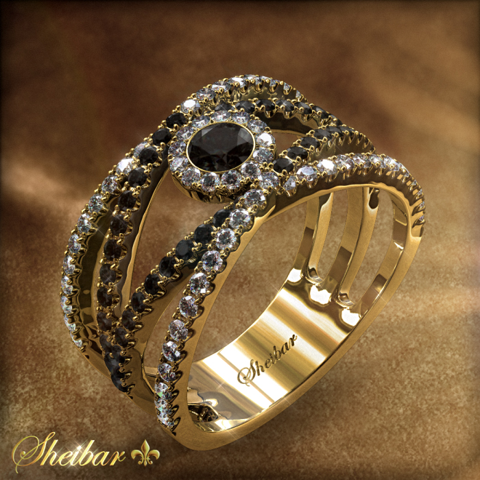 Milan" diamond ring, a beautiful and original design ring. This impressive ring is designed in a variety of gold elements and shapes from different directions. At first you can see on either side of the ring about 3 rows of delicate gold on which are studded with high quality diamonds. The beautiful and interesting combination of the ring is the mixing of white and black diamonds, which gives the ring a unique look. On the upper part, the middle band of gold is divided into two additional gold pillars, which are also studded with diamonds. After this impressive display of gold pillars studded with small diamonds, the head of the ring is studded with a large diamond surrounded by small diamonds that serve as a kind of "crown" for the diamond, forming a beautiful arched tray of diamonds from all angles of the ring. Without a doubt an impressive and prestigious ring with 131 diamonds. A unique and prestigious designer ring that spreads amazingly on hand.