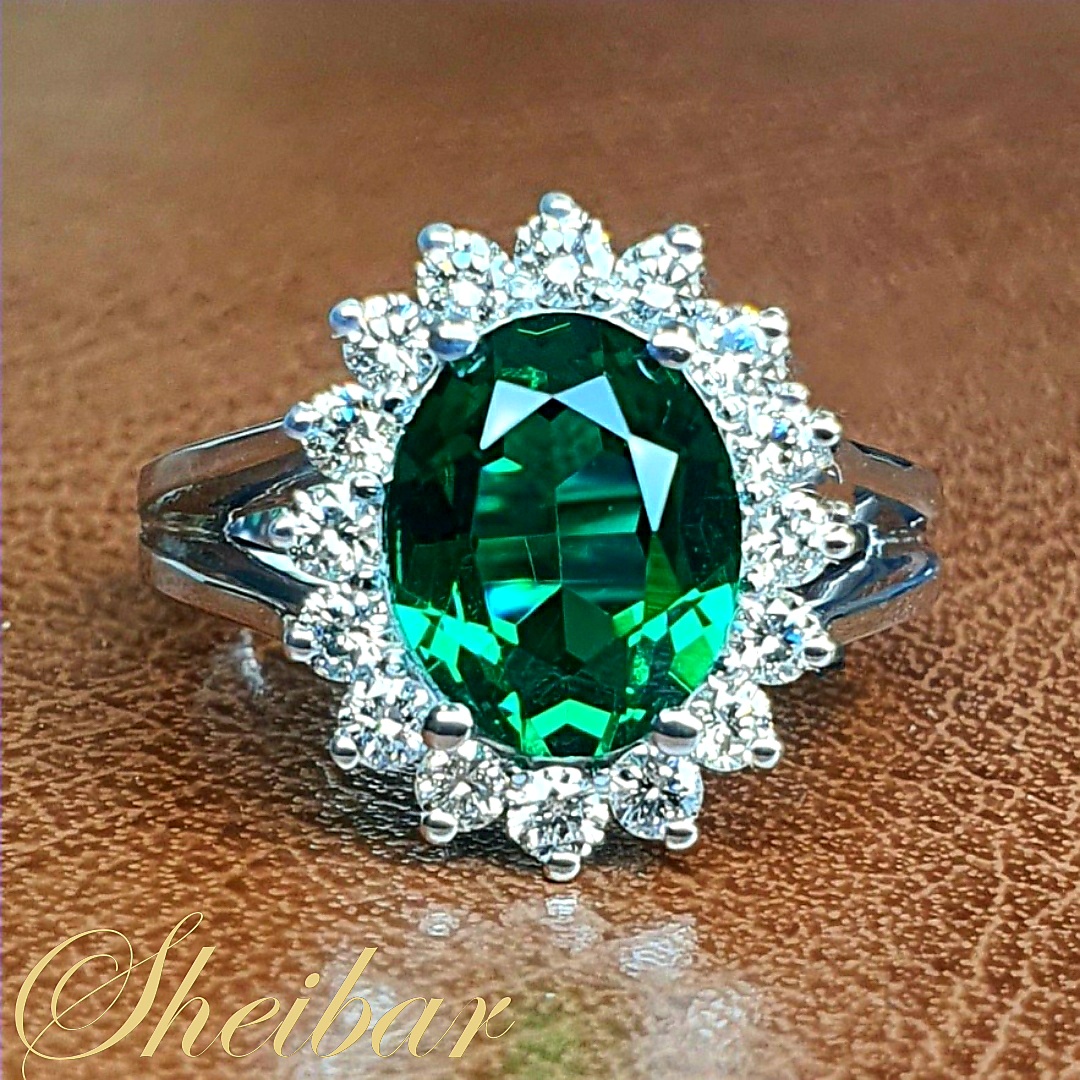 Emerald and diamond rings, the name of which is the Princess Diana ring. A princess ring in an upgraded and amazing design, with high quality work. First you can see the work from the base of the ring when it starts in one row of smooth gold and at the top splits into two smooth and beautiful gold bars. The gold is the most smooth and clean 18k gold. At the top of the ring you can see the amazing head, which has a great presence. In the center of the jewel there is an amazing green gemstone, "Oval". Surrounded by this stone are white and large diamonds, which give an additional effect to the jewelry and create high quality work. Without a doubt the most impressive ring that will fit to any princess