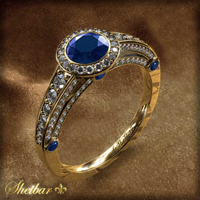 Sapphire and diamonds, the "Tiffany" model. A unique and prestigious ring, not for the faint of heart. A ring studded with diamonds in all its upper half of all sizes, a total of about 116 diamonds, and the ring profile can be seen in the shape of two arches embedded with small diamonds that go from the ring to the center, and in the profile of the ring in addition to three large gems. On the upper side of the ring is a central diamond that comes with sapphire gemstone, clear blue and beautiful, surrounded by other small diamonds.The ring itself is designed and consists of 3 different parts that complement the perfect result This ring is a ring that just can not be missed
