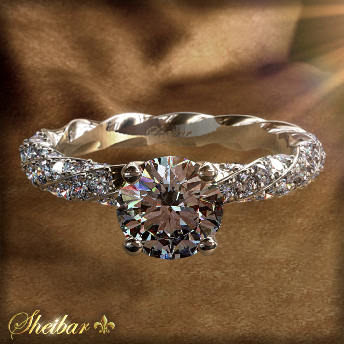 Engagement rings designers model "loops". This special ring can be seen in its unique shape, all of which is shaped in a curly and precise manner throughout the ring. With about 50 small white diamonds studded around the ring around these delicate coils of gold . In the center of the ring is the central diamond, which is studded on four shiny gold teeth that accentuate the diamond and thus make the whole jewel look amazing . ( In addition to this ring there is the ring that accompanies it to make a beautiful set )