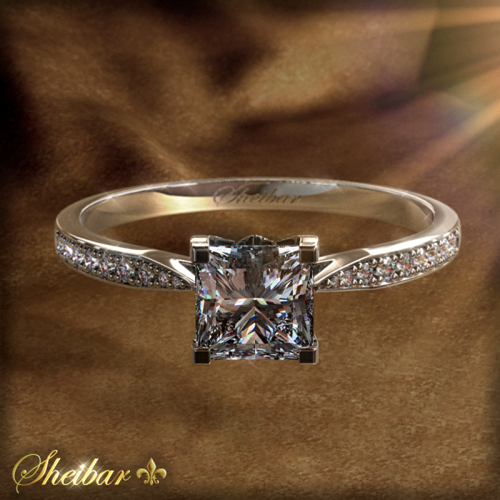 Ring "princess" ring special design and impressive. When gold work done symmetrically, honest and very accurate. Diamond embedded in the sides of the ring were set with "rail" which bordered on two rails on both sides delicate gold diamonds and thus give a unique beauty ring and even small diamonds. Ring out from the main and most important part of the ring is the head of the center diamond, which takes four teeth beautiful and full of presence, in these amazing teeth inlaid diamond center square and unique PRINCES. (You can also embed a round diamond of your choice)