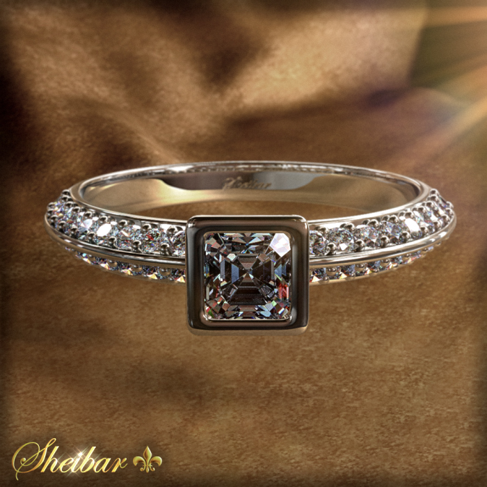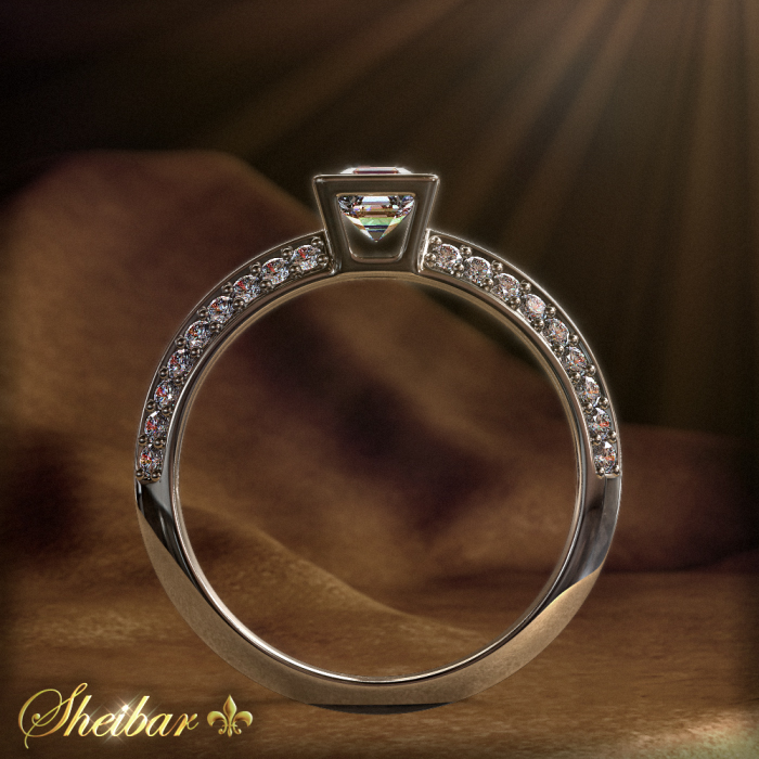 ngagement ring "Princess Satite" diamond ring. An unusual classic ring, with two rows of diamonds set on the ring at a diagonal angle on either side of the ring. In fact, you can see the sparkle of small diamonds on both sides of the ring, between these two rows of diamonds separates a fine and smooth gold stripe. The center of the ring is studded with a central diamond, polished with a special "PRINCESS", with a "cup" on it. This inlay gives greater presence and volume to the diamond, and thus looks larger. In addition, the diamond is embedded much safer way . A classic ring with an interesting design