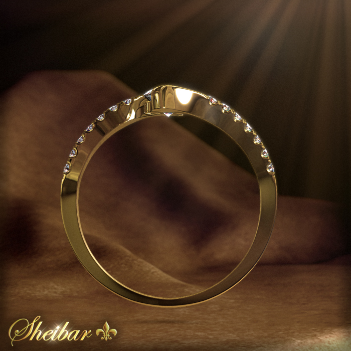 Model Engagement ring "mazal", twist ring. This engagement ring is designed in the form of its famous twist, with the ring ring starting from the base of the ring and rising up each side interpreted in another direction, creating an interesting twist. This ring is delicate in its beauty and very special. On both sides of the ring are high-quality diamonds on shiny gold, while in the center of the ring you can see a beautiful center diamond weighing 0.25 inlaid between the two golden walls of the ring without teeth and thus is at the same height of the gold without the "bump" of the diamond