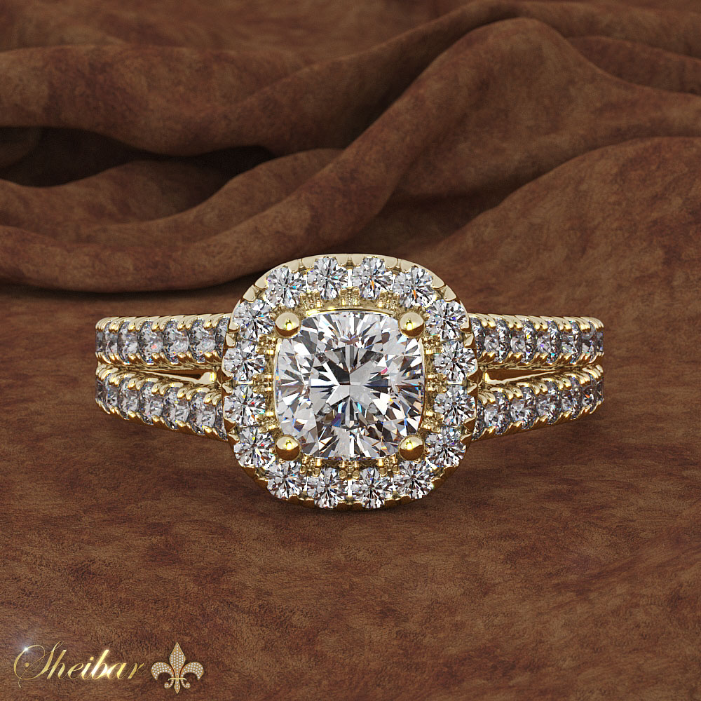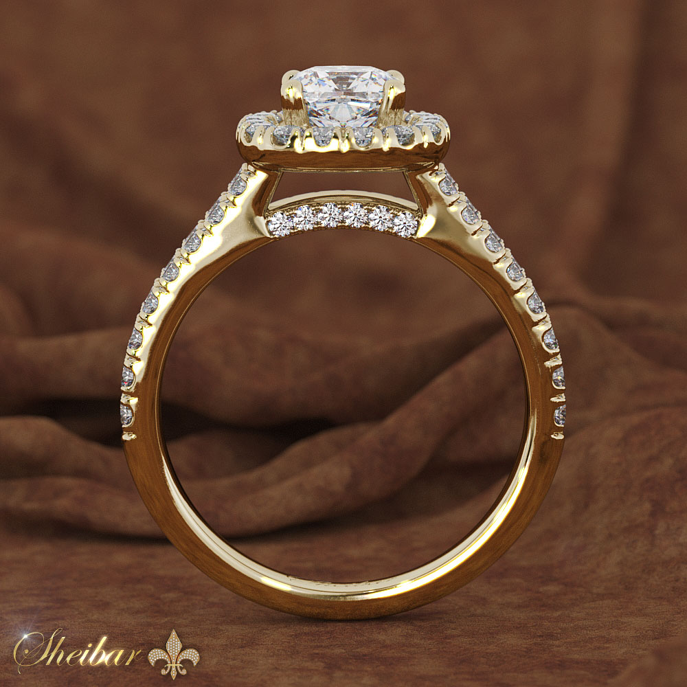 Engagement ring: "Dako". A very impressive engagement ring with weight, presence and beauty. The ring consists of two parts. The ring is made of gold, wide and full of diamonds. Each diamond is studded with 4 teeth, but does not block the light and its full potential. Towards the head of the ring, the bridge that gives support for sleep itself is also embedded on both sides. The head of the ring is in the shape of a wide kushan, studded with diamonds, with a lovely natural princess diamond on its 4 teeth. A ring for people who love large, impressive and presentable jewelry that can not be easily forgotten.